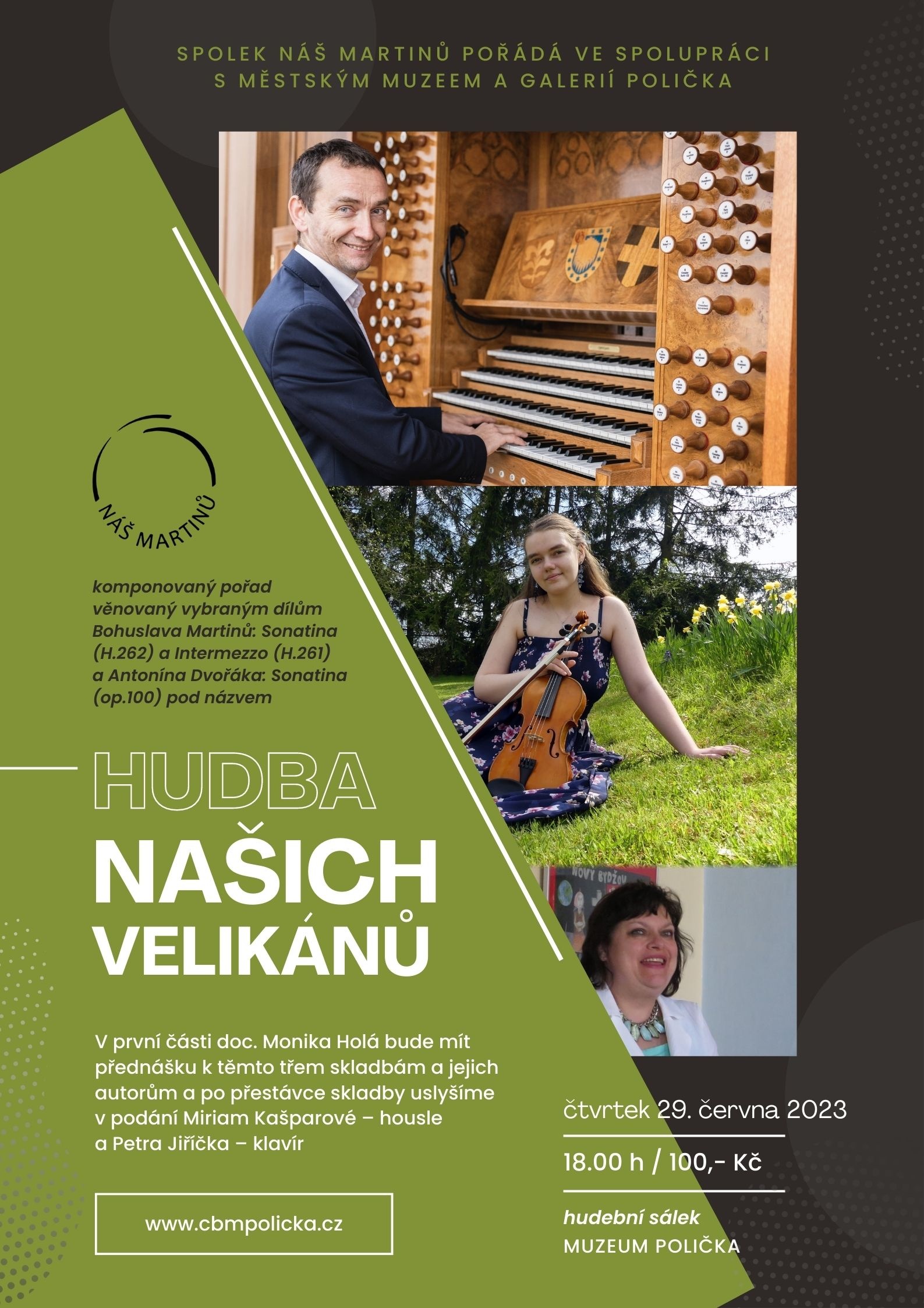 Komponovaný pořad bude věnován vybraným skladbám Bohuslava Martinů: Sonatina (H.262) a Intermezzo (H.261) a Antonína Dvořáka: Sonatina (op.100). Akce bude mít dvě části – nejprve doc. Monika Holá bude mít přednášku ke skladbám a jejich autorům a poté skladby uslyšíme v podání Miriam Kašparové – housle a Petra Jiříčka – klavír.  Po skončení koncertu proběhne beseda s interprety.